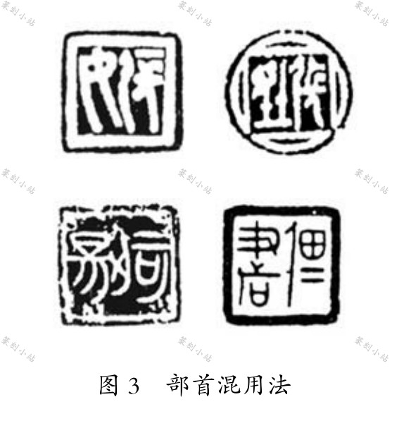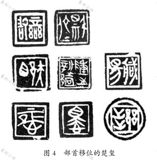 部首移位法。 部首移位实际上是文字的异构变形。 楚人制印时, 为了适应章法布局的需要, 往往采用变更文字构形以求印面整体的和谐。 异构变形包括部首左右互换、 横向构成改为纵向构成、 构件转向、 文字整体倒置、 整体反置, 等等。 楚私玺“佗人” 之“ ” 的部首左右互换; 楚官玺“陈之新都” 之“都”、 楚私玺“邞目” 之“邞” 的“邑” 部被移置到了左边。 楚私玺“恒”、“怿” 本为左右结构, 改变为上下结构。 楚私玺“ 敢” 之“ ”, 将两个“纟 ”与“言” 字之“口” 并