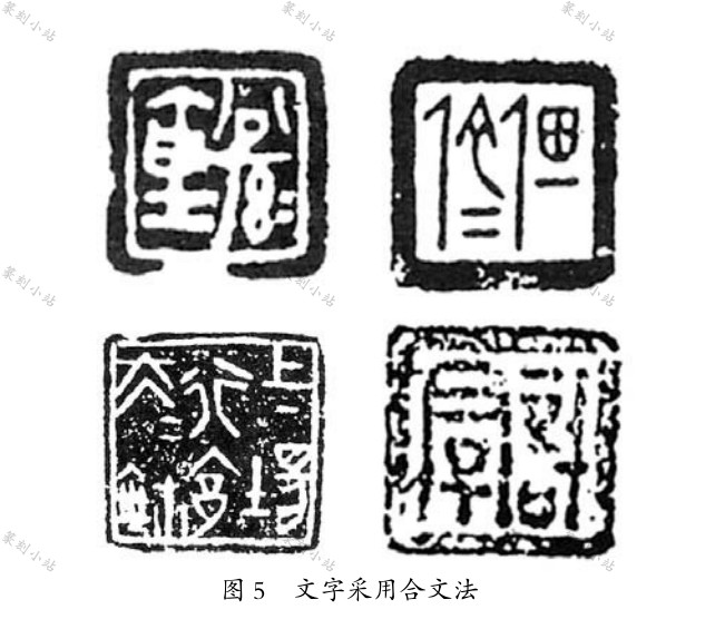 合文法。 楚玺文字的“合文”, 一般采用借体合文的方式, 共享某一构件, 显得巧妙有趣、 省工省时, 是上佳的合文之法。 楚私玺“公孙仓”、“佃佗人”, 楚官玺“上场行邑大夫” 等, 合文合得巧妙,宛然天成( 图 5)。