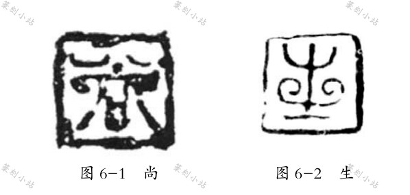 文字的装饰美化。 楚系文字的装饰美化现象较为普遍, 楚人创制的鸟虫书就是典型的美术字。 这种文字在楚玺中也有体现。 从目前考古材料看, 楚鸟虫玺数量并不多, 用得最多的是燕玺和晋玺, 如燕玺“率加信”、“孙陈”、“事弓”、“王张”、“公孙郾”、“ 留”、“公孙秦”, 晋玺“司寇鸣”、“肖 ”、“畋弃” 等。 考古发现的楚鸟虫玺有“尚”、“生”字玺( 图 6), 此玺 1956 年在长沙左家公山 24 号楚墓中出土。“尚” 字笔画弯曲盘绕, 显系鸟虫书无疑。楚人有装饰文字的传统, 鸟虫书又是楚人最早创制,并在战国时期的吴、 越等地流行多年, 为何楚地出土的鸟虫玺屈指可数, 而在很少发现鸟虫书铭文的燕国和晋国, 却恰恰盛行用鸟虫书治印的风气? 这实在令人匪夷所思。
