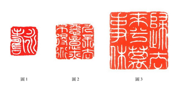 历代篆刻家针对「细白文」 创作印作的數量并不多, 在邓石如之前的篆刻家约有: 文彭(1494~1573)〈 寿承氏〉(图 1)、 陈渭〈 人不去惡意亦不得道〉(图2)、 吴兆杰〈 归去來兮万事休〉(图 3) 等人有所创作, 不过吴、 陈两人的篆法缺乏原先小篆的圆转笔意, 显然仅是将汉印篆字隶化趋近方笔的处理方法, 线质略有碾玉印的细致表现。