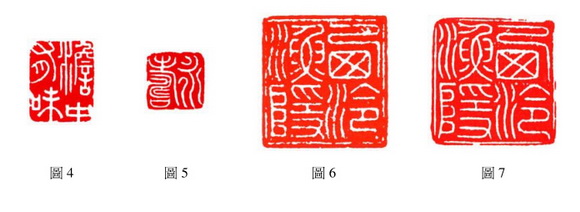 此类「细白文印」 与一般白文印不同的是, 文字并不取用隶化后的繆篆, 而是直接以秦代刻石或李阳冰等小篆写法以书入印之作。 与邓氏同时期的有: 施象坤(1743~? )〈 澹中有味〉(图 4) 笔趣十足、 方圆并济, 亦是一方佳作。 黄易(1744~1802). 约五十岁为梁肯堂刻〈 永寿〉(图 5) 正方白文印 , 也是近似的表现手法, 这种书写笔意的印风在其作品中的比例确是极少。 由此可知当时此类印风数量寥寥可数, 足见山人细白文印风的养成大多是自我体悟而成的。