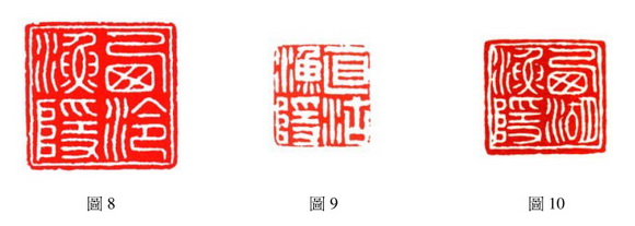 程远白文印〈 西泠渔隐〉(图 8), 因梁氏与程氏生卒年不详, 难以判定何人先刻此印, 还是何震等早先的篆刻家曾刻过, 之后两人同时临摹此印? 排除这一假设, 从印面完成度來看, 后者似乎较成熟稳健。「西」 字「窗」 形明显压缩,可见程氏在临习时并不是照单全收, 线条趋于圆融, 布字紧密自然。 与《訒安集古印存》 收錄的〈 西泠渔隐〉 结构、 章法颇为相近。