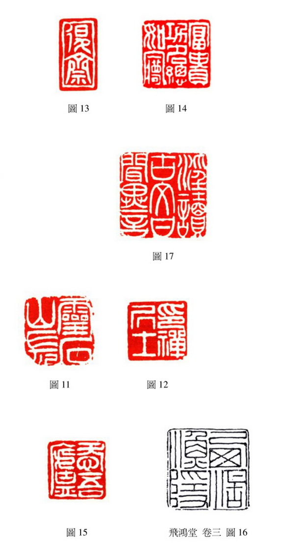 邓石如所作白文印〈 西湖渔隐〉(图 10), 依上述即可概知其源流传承, 此印与〈 靈石山长〉(图 11)、〈 印禪居士〉(图 12)、〈 退斋〉(图 13)、〈 富贵功名总如梦〉(图 14)、〈 爱吾廬〉 (图 15)同时收录於汪啟淑编辑的《飞鸿堂印谱》 ,其中「退斋」 为汪氏别号, 孙慰祖亦怀疑「印禪居士」 与「西湖渔隐」 也是汪啟淑的别号。 多年前曾有学者, 指称邓氏此印乃临摹梁氏, 近年也有学者說是临摹程氏之作, 我们将三印一併比对, 结果可知, 无论从笔意(渔字「鱼」 部左右两边是圆弧形; 西字「窗」 形略扁)、 形质來看, 都可确定, 邓氏应是临摹程氏无误。 此印邓氏起笔与收尾笔画都成「尖形」, 与〈 富贵功名总如梦〉、〈 靈石山长〉两方印刀路相近, 边栏线条不甚平整, 有秦汉凿刻将军印之趣。 虽与原作不同,某学者指出係邓氏刀法不熟练之故? 此说似乎可议, 应是邓氏寻求创新的自我表现, 也形成另一种流动婉转的特殊风貌。 另外《飞鸿堂》 卷三刊录一方朱文印〈 西湖渔隐〉(图 16), 作者未详, 以汉朱文章法刻製, 线质工整, 佈局稍嫌呆板。
