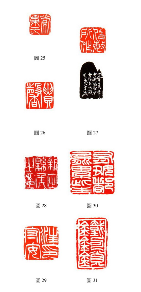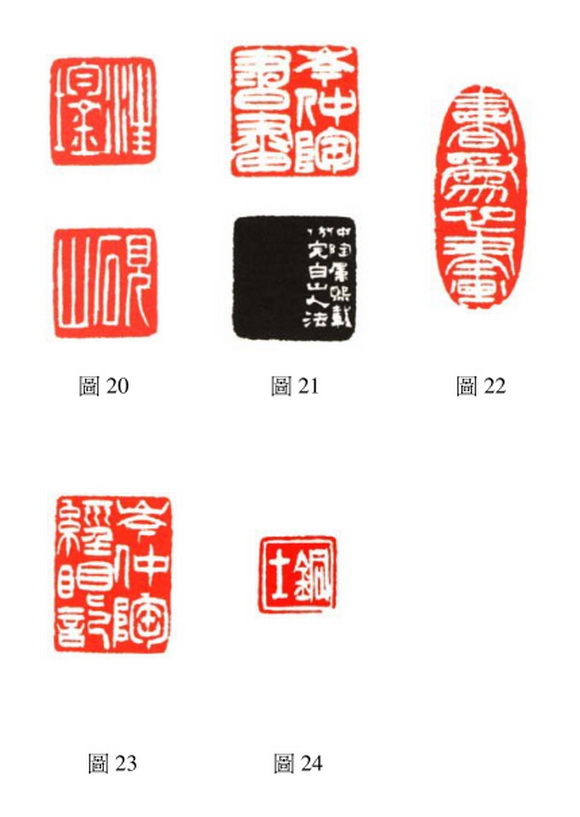 吴让之的白文印〈 汪鋆〉、〈 砚山〉( 图 20)( 两面印), 有姚正鏞跋记:「让老刻印, 使刀如使笔, 操纵之妙, 非復思虑所及, 自云师法完白山人, 窃谓先生深得篆势精蕴, 故臻神极, 其以完白自画者, 殆谦尊之光耳, 砚翁属为题记, 敢以图人之見奉质, 以为何如, 光绪九年二月十九日, 距作印时已廿餘年矣, 盖平姚正鏞仲海甫識并鐫」。 另外, 吴让之在边款中记载仿刻山人的有: 白文印〈 岑仲陶书画〉(图 21) 款记:「仲陶属熙载仿完白山人法。 」 白文印〈 书为心画〉(图22) 款记:「淑完白山人法, 仲陶世二兄清赏, 让之, 时年六十有一」。 白文印〈 岑仲陶经眼记〉(图 23) 款记:「仲翁属, 熙载仿完白山人。 以及白文印〈 铜士〉(图24) 款记:「仲陶二兄属, 仿完翁, 庶几不失则矣, 让之。 」