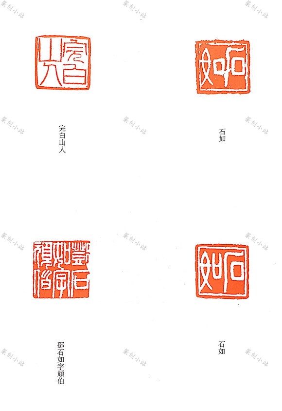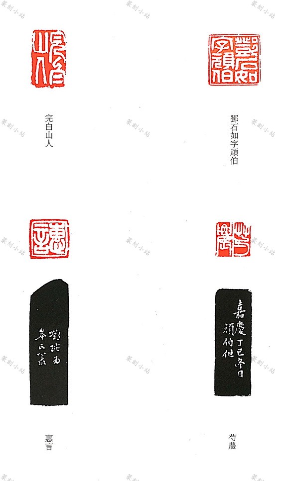 邓石如( 1743—1805 )初名琰,因避清仁宗颐琰讳,以字行,名石如,改字顽伯。因家居皖白山下,而取号完白山人, 别署完白、完白山民、龙山樵长、游笈渔人、古垸子、叔华等,安徽怀寧人。著有《完白山人印谱》。