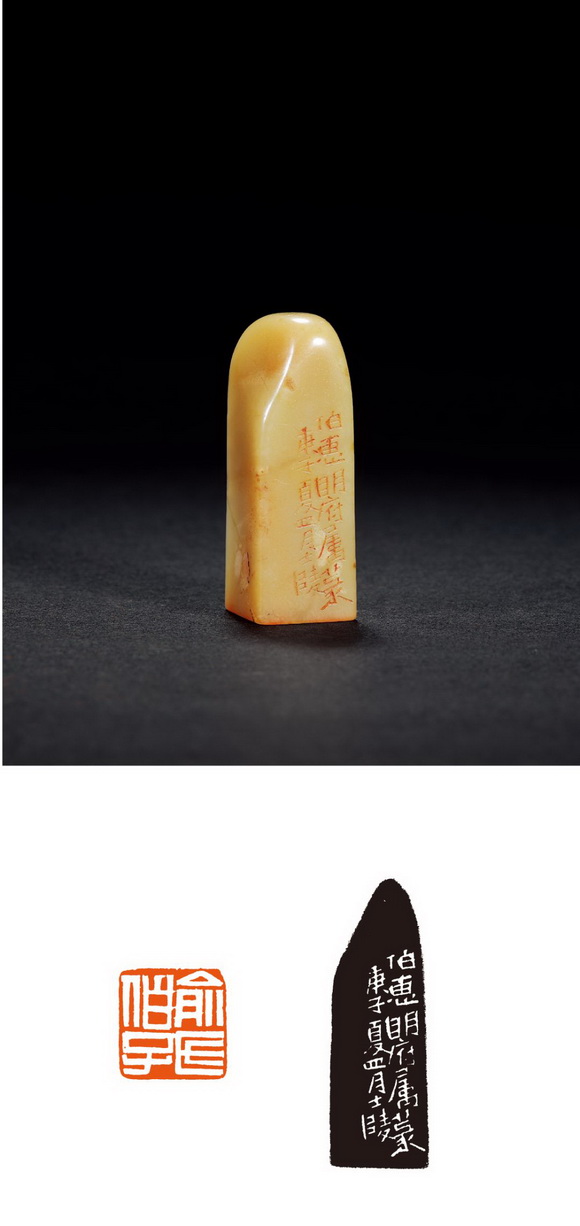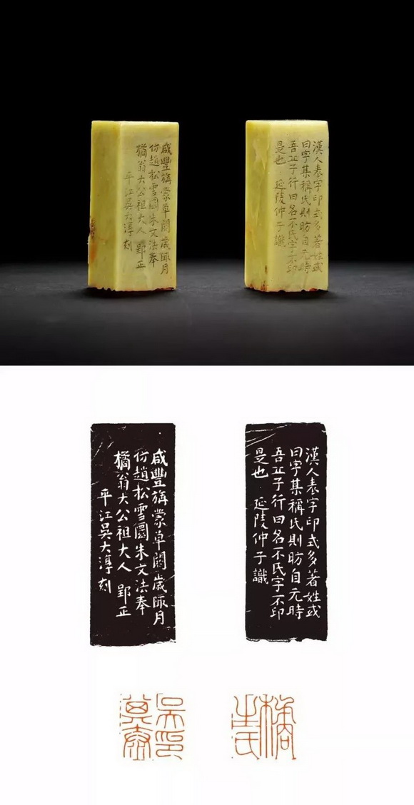 边款:1.咸丰旃蒙单阏岁陬月仿赵松雪圆朱文法奉橘翁六公祖大人郢正,平江吴大淳刻。 2.汉人表字印式多著姓或曰字,其称氏则仿自元时吾丘子行曰名不氏字不印是也。延陵仲子识。