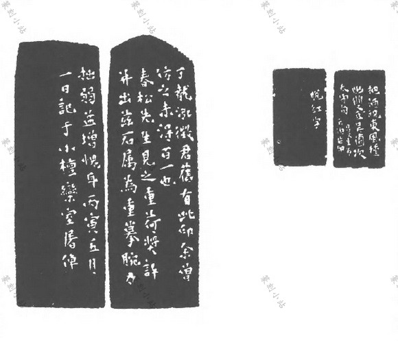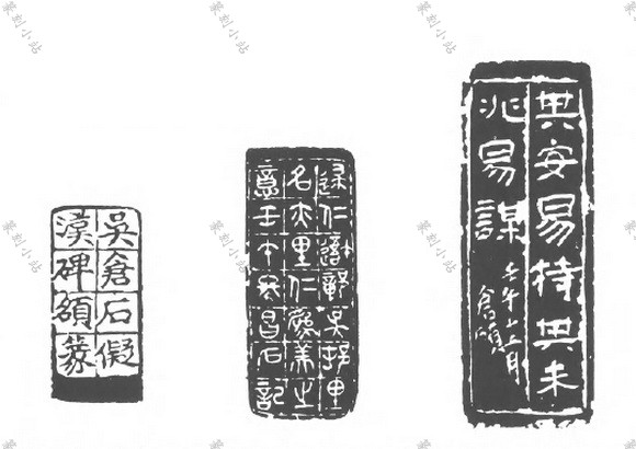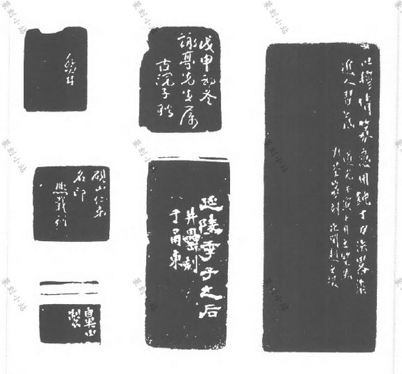印款的佈局,形式多端,极富变化。寥寥数字之款文,佈局多自成一格,或一行,或一排, 或一小区,大多大面积留空。数十言乃至数百言之长款,怖排在一面或多面之中,怖局往往与立轴、手卷、册页、斗方等形式的书法作品有相似之处。