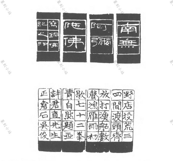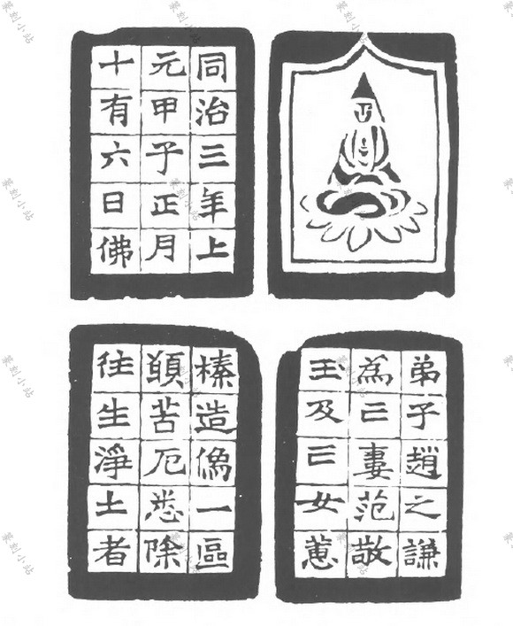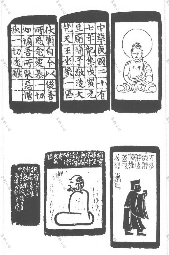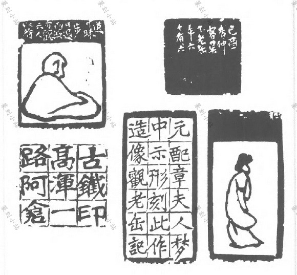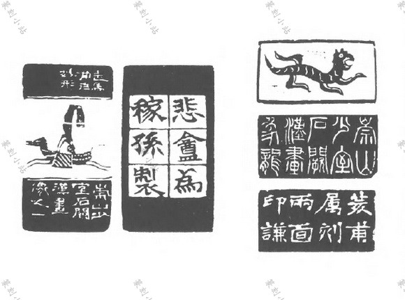 图文组合的款,指印款由图画和文字组合而成,可分爲单面和多面两类。图与文各自独立 者,称爲分区式。图与文结合成一体者,称爲相间式。分区式较常见,相间式较稀少。
