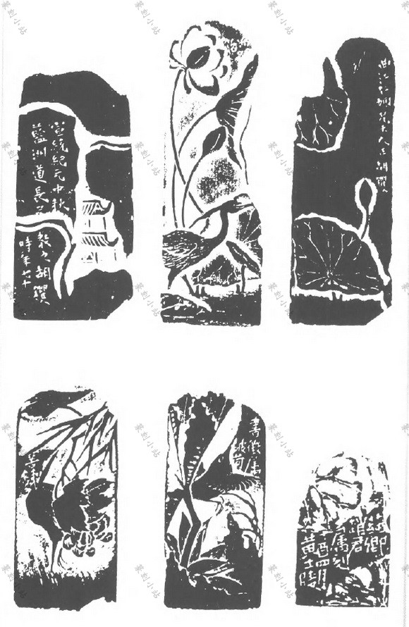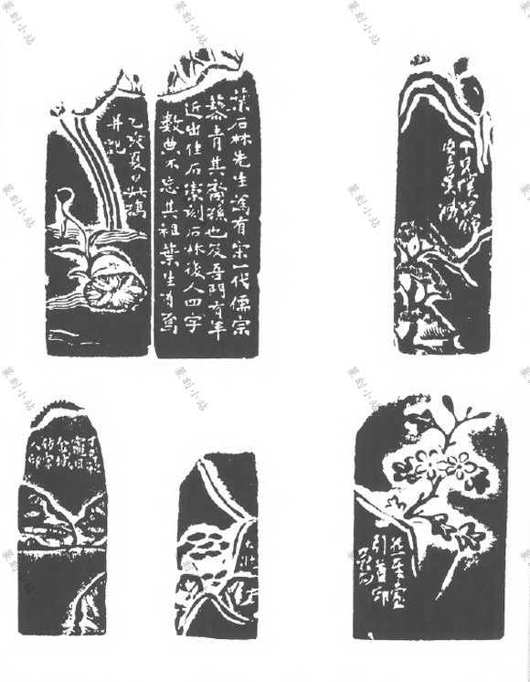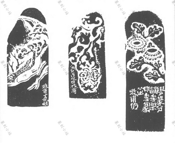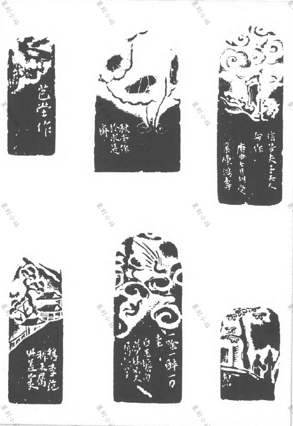 钮纹,即印章顶端或顶侧的印钮图纹在印侧向下延伸的部份。薄意纹,即印体上薄型浮雕 的图纹,有一面至四面、五面之不等。结合钮纹、薄意纹的款,指布排在钮纹、薄意图纹之间 或接近处的款文,款文有置于图外和置于图间两种方式◊图间者变化颜多,有的居昼面之角, 有的靠画面之边,有的穿插于昼面中间,与绘画中的题跋有近同之处。