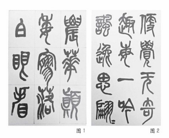 图1、图2两幅作品都是来楚生晚年所作,整体笔画粗细不一,但又和谐统一。结字中宫收紧,部件之间参差错落,作品较为精神,毫无晚年衰败之象。篆书作品的风格特征直接在边款中体现出来。