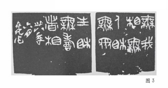 图3为来楚生1949年所刻的佛像印边款,对比上面的篆书作品,可以窥探出篆书和篆刻的一致性。从体势来着,边款上的篆书字形压扁,大篆特征明显。结字方面例如“相”的“木”字旁与图1中“委”字的“禾”形状一致,整体不衫不履,参差错落。