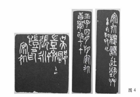 图4三方篆书的边款,从此三方边款更能看出其篆书对边款的影响,也正印证了“印从书出”这一理论。结字和其篆书风格大致无异,在没有界格限制的情况下,疏密表现得更加自然有趣,再加上刀与石的结合,以及线条的斑驳和笔画的粘连,而生出浓浓的金石气息,作品显得古朴生动,趣味盎然。