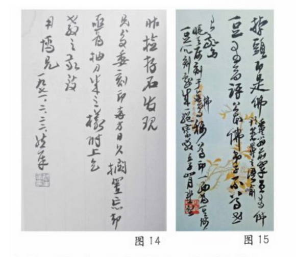 他的行草书因为有篆隶书的基础,加以用功尤勤,线质厚重、古朴,有锥画沙、屋漏痕之意,中锋用笔,使转自然,给人以入木三分、力透纸背,沉稳大气之感图14图15(如图14、图15)。来楚生的行和楷书直接在他的边款艺术上得到体现,只是在印石上书写s章法和结字变得更加整殇,力度和金石感得到发挥,显得更加古朴、沉着、酣畅淋漓。