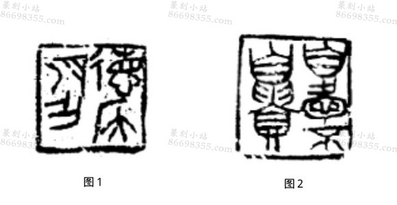 “德侯所作”(图1)纯古玺式印作,古玺的文字不以点画伸缩为能事,多采用繁简各随其意的构成形式,在意趣上落落大方,古率闲远。但古玺又多圆弧之笔,造成字间细小空间过多过碎,其典雅的气象多由短小、圆融的线条组成。“德”字的右上角,“侯”字顺承其势,“所作”二字攲侧且作“反书”,既与德字力点保持一致,又造成中部整块的空白流动,全印动感极强,富有音乐感。