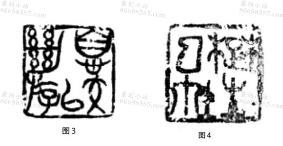 “楚生私玺”(图4)朱文巨印可与吴昌硕“石人子室”相媲美,来楚生以萧散悲壮为旨归,求生求拙;吴昌硕以雄浑恣肆为宗旨,求厚求朴。