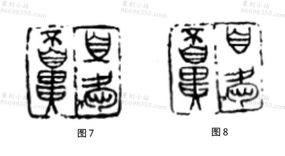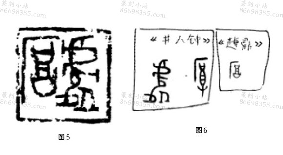 古玺文字数量有限,常常需要借助钟鼎文字入印,“处厚”(图5)即是一例,从《金文编》中查出二字原型(图6)来对照分析,发现其用心处有三点:一是边框内白的回环状气流使得章法远离汉印模式,而不是靠文字跌宕感来刺激感官。二是金文的线势提示被明朗化,《井人钟》的两个“处”字稍加变通,且在右边中部多了一小竖笔,它的重要性在于抵住了空白对文字的侵入,使其气势贯通而下。三是“厚”字改用《赵鼎》并非偶然,因其外形更适合与“处”字的呼应。反之用《井人钟》的“厚”字下多一竖笔,如蛇添足,空间被分割,气象也大打折扣。