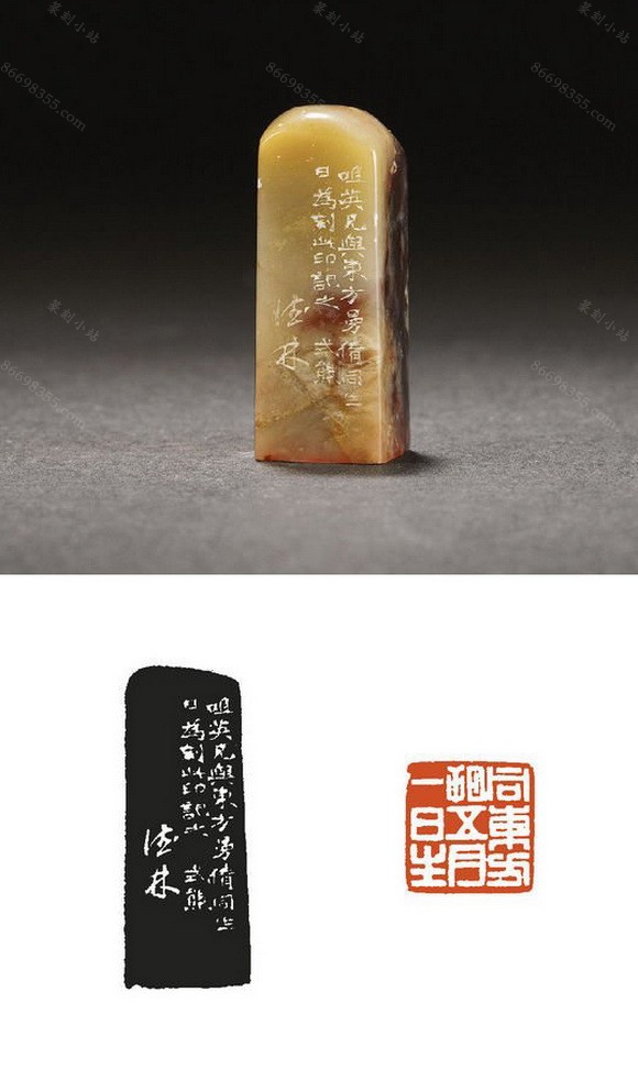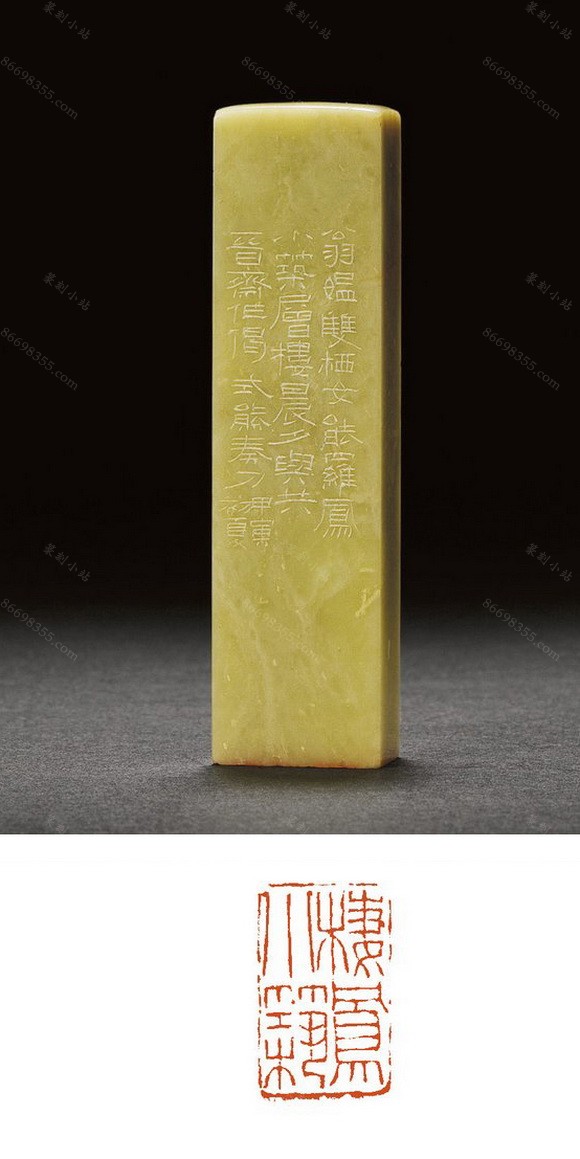边款: 翁媪双栖,女能罗鳯。小筑层楼,晨夕与共,晋斋作偈,式熊奏刀。甲寅初夏。