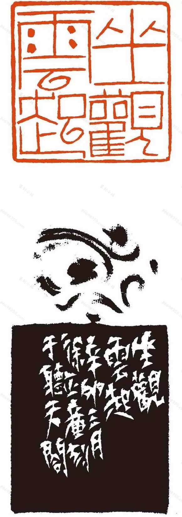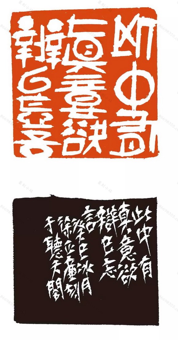 将大写意冠之于篆刻是首创的。所谓写意,是相对于写实而言的,即得对象之神,而略对象之貌,并不是仅指手法粗放。从这个意义上说,我们并不能认为此集中的作品得了对象——文字之神,而略了文字之貌,因此并不妥当。也许只有葛冰华的一些作品得公章之神,略公章之貌。