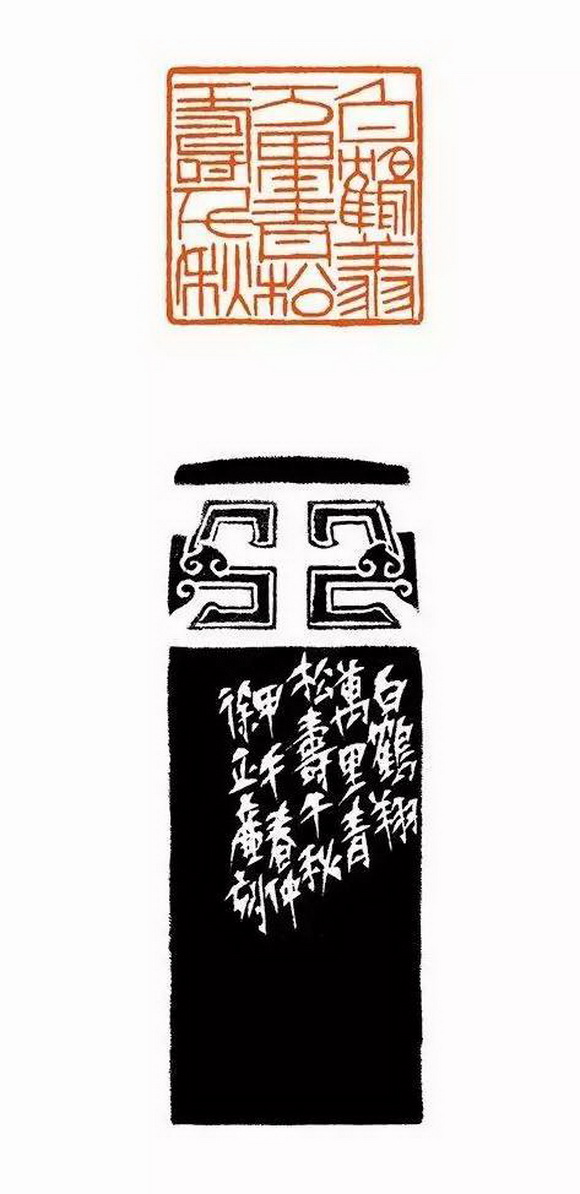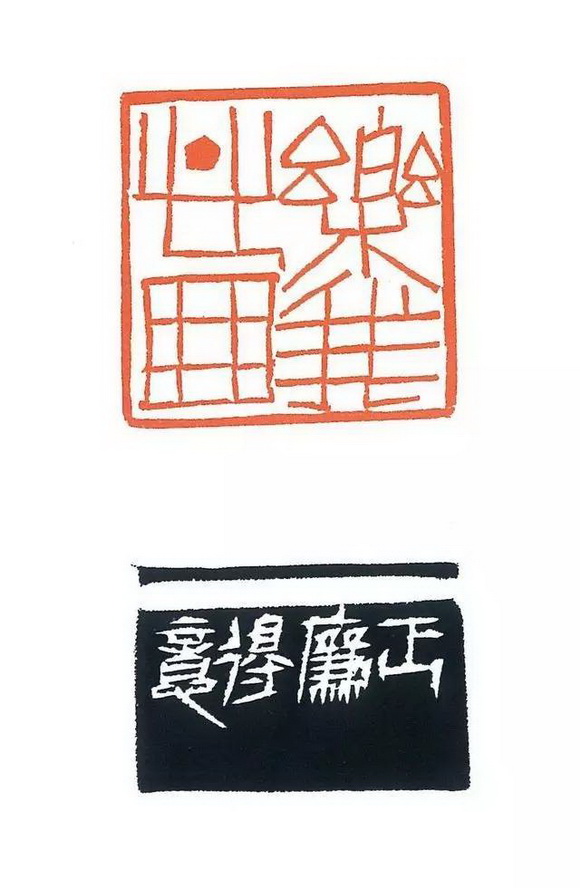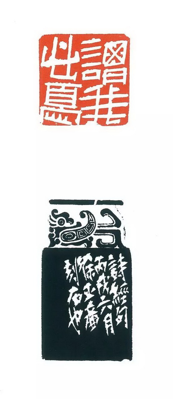 这其实是一个太陈旧的问题了,就像我们已经不讨论地球是方的还是圆的那样。字法的统一,我们以前一直认为是指:大篆只能和大篆用在一起,小篆只能和小篆用在一起,缪篆只能和缨篆用在一起。但其实只要我们仔细一点,就能发现丁敬、吴昌硕、黄牧甫、齐白石等许多篆刻大家,都有用字不统一然而成功的范例。我说的是“成功”,用字不统一,气息却浑然一体,这才是真正的高明,比用字统一还要高明。其实不但在创作追求上需要不统一来营造“奇”的境界,在实际应用中也有不得不如此的需要。你想,大篆文字能有几何,怎麽够我们实际创作的需要呢?文字是在不断发展的,从春秋战国到现任,无数的字死亡了,又有无数的字诞生,你去翻翻《康熙字典》,十字九不识,许多后来诞生的字根本就没有过篆书的形态,而篆刻创作又都是今天的内容,因此要强求字法的统一几乎是不可能的,甚至完全用标准的篆书都不可能。既然难以完全做到字法统一,甚至还不能不杜撰,则显然我们更应该关注的是气息的统一,像上面提到的丁敬、吴昌硕、黄牧甫、齐白石那样。当然,这也需要功力,甚至需要更高深的功力。我们不要太机械,我再说句仅仅从学术角度出发、可能不顾及社会效益的话:我们都很佩服黄宾虹的篆书奇古,但文字学家早就发现,黄的许多字形都是杜撰的!当代章草大家王蘧常写文章、写信都用章草,历史上哪有这麽多章草字形留存下来,很多都是他创造的!当然,我决不是在这里主张年轻作者可以随意“造字”。实际上,要像黄宾虹、王蘧常那麽“通达”,会“造宇”,首先要对文字有深刻的理解。