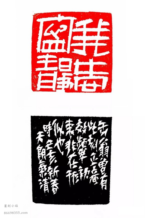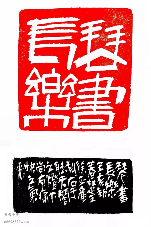 琴书长乐 (6.6×6.6cm) 这是我最近的作品,未必能入时人之眼。我喜欢表现奇肆的意味。奇有雄奇和巧奇之分,我觉得如果不在“雄”上着眼,奇是走不远的。吴昌硕、齐白石、来楚生都是雄奇的榜样。但榜样也是桎梏,能否挣脱他们的桎梏,走自己的雄奇之路?我希望能以简洁、干净的手法表现一种不张扬跋扈的雄奇,威而不怒。难,尝试而已。这印我现在喜欢,能否持久则需要时间检验。