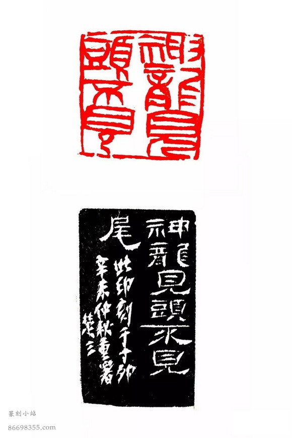神龙见头不见(尾) (3×3cm) 此印或可以说是我的所谓“成名作”,是这里面年代最早的一方,刻于1988年,是全国首届篆刻艺术展的投稿。神龙见头不见尾,所以“尾"字故意不刻。小巧诡异之道,竟至今还为许多同道记得,惭愧。其时我35岁,正沉迷于来楚生先生,这从印风上看得出来。