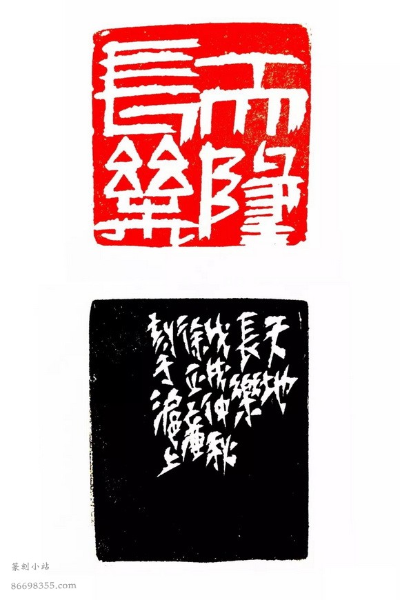 天地长乐 (3.8×3.8cm) 有些字比如“天”,线条末端的“燕尾”,在篆刻传统的陈说里是“病”。我在这里则是有意为之,意在表现率意书写的笔锋意味。是否刻意了?是否表现得太用心太显然了?探索中。