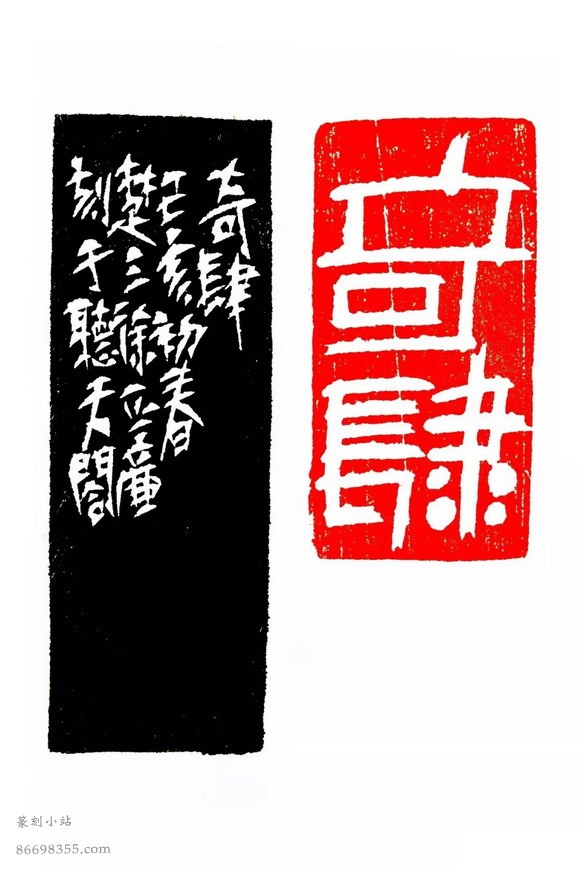 奇肆 (4.8×2.4cm) 说过,我很有表现作品奇肆的欲望。这方印刻的是“奇肆”,感觉上奇还是不够的。但是“奇肆”和“大气”有时候矛盾,奇表现得过了往往有伤大气。大篆奇诡绝伦,但是论大气,恐怕就比不上汉篆的方正端凝。所以如何掌握合适的度,恐怕就是篆刻成功与否的关键。