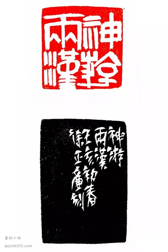 神游两汉 (3.8×3.8cm) 此印还是汉印的范畴,而文字结体和线条形态强化了书写的意味,略有别于汉印的“铸”和“凿”,或也可以说游移在汉印和流派印之间。这不是我的创造,赵之谦和黄牧甫都是这么走过来的。