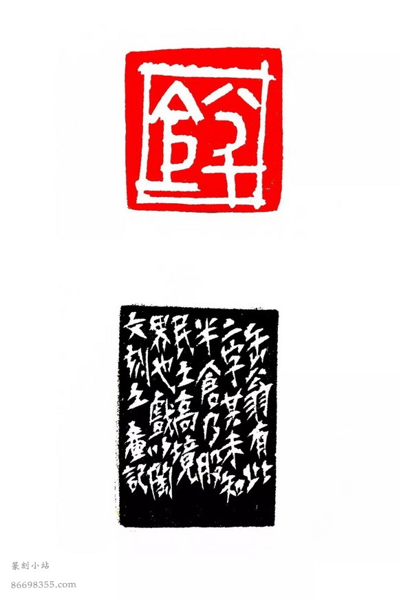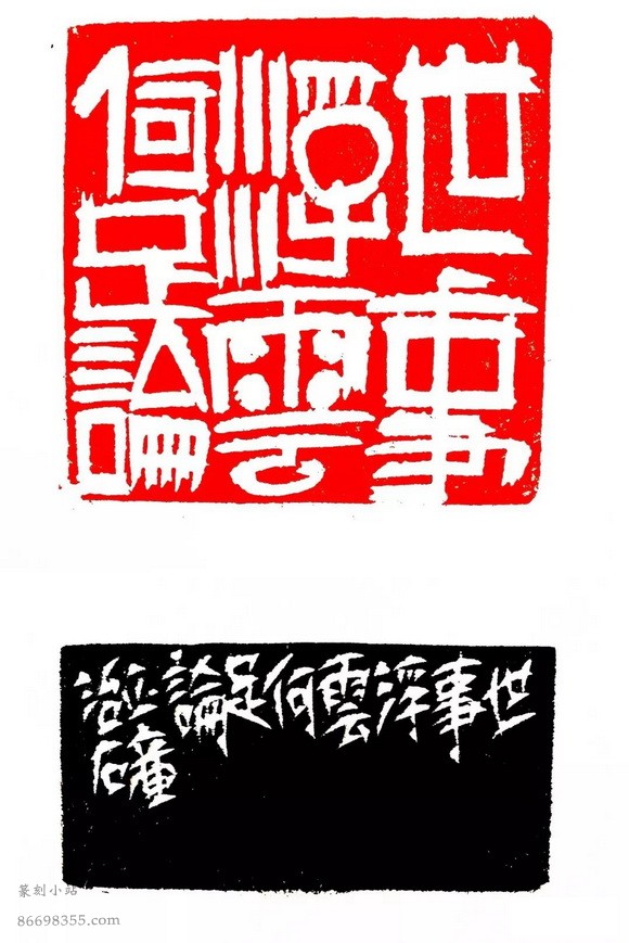 世事浮云何足论 (4.6×4.6cm) 章法上有将军印的意思,线条上则更注重书写的表现。我觉得齐白石就是这么表现的。当然此印在气势上力量上逊色老齐多矣。