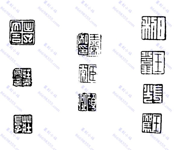 三套印,由大中小三颗单面印套合成一个整体,印语方 面由姓名与姓名及表字、姓名印与姓名书简及表字、姓名印与姓名及白方、姓名印与姓名及吉 语、姓名书简与姓名书简及表字五种常见的配合法。
