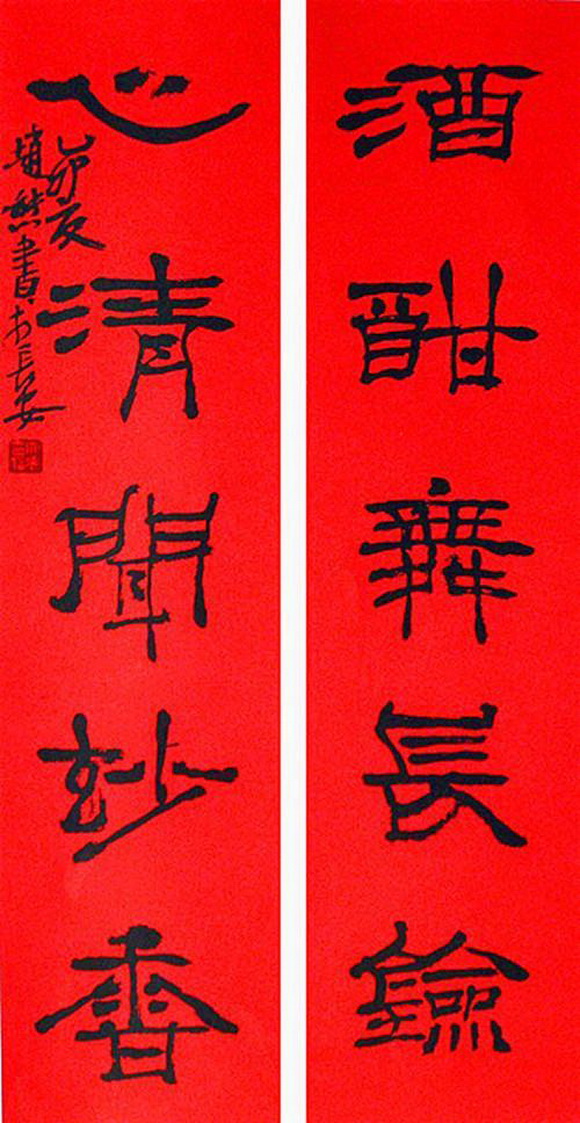 赵熊先生的书法功力扎实,诸体皆能,尤以篆隶和行书著名,创作出别具一格的”五分书”,即以篆书之形,表隶书之神,篆隶笔法各取一半,入古出新,气势磅礴而旷达。
