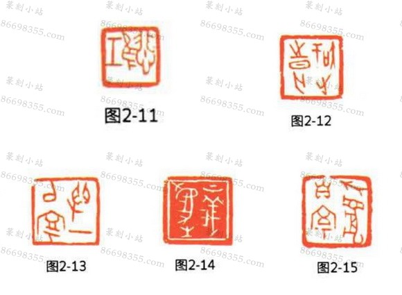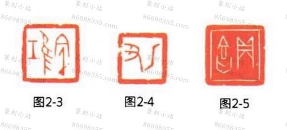 另如“大雨儿”(图2.19),三字角度方向的差异使得整个印面文字活泼可爱、动感十足,配之以宽厚的边框,加强了动静的对比。这种字型处理模式,虽不多见,但对我们现在的篆刻创作亦颇具借鉴性。
