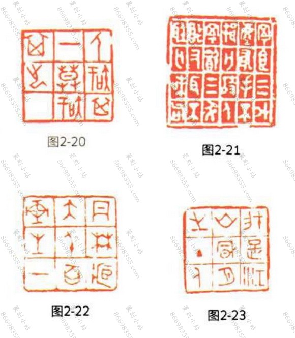 其一,先将印面施以界格,文字逐一安排在界格内,这样一来,每一个文字就有一个单独的空间。这样的处理手法,难度略低,但保证了多字之间的秩序感和统一性。如“人知其一莫知其先”一印(图2.20),由于字数不足,索性将最后一格空出,其余八字依次分布,在整体章法空间上虽然没有新奇的艺术处理,却平实安静、合理有序。白文“宁食三斗尘有手不揖无诗人宁饮三升酒有耳不听无味句”二十四字印(图2.21),直接参仿汉印一路,对章法借鉴的同时,线条也加以相对浑厚凝重的处理,从而保证了印章整体的统一。