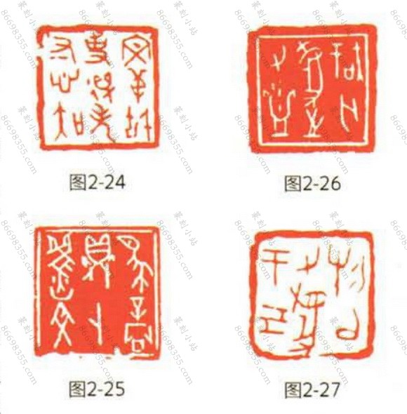 字数稍少的六字印中如“集商鼎卜旧文”(图2.25),所谓“字法生章法”于此可见,将单字拆分后,每字于印中所占空间基本均等,结体看似平淡,然经组合后,三列印文间“连”与“断”的对比分明,加上“唯”与“旧”字形本身所具有之动势,都使得整方印浑然一体,自然天成。同样采用左中右三列排列法的“知无为之有益”一印(图2-26)则根据字形的长短进行穿插组合,以竖长线条为主导,增加了印面的排比效果;加上“益”字上部大小不同的竖点,也进一步提升了此印的品味。