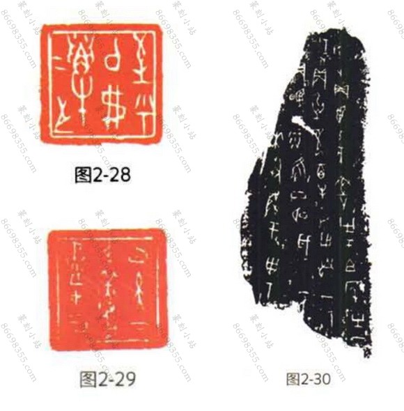 “以天下之美为尽在己”一印(图2-29),文字与边框稍显细弱,而这种刻法在甲骨中不难见到,在与图2.30的比较中可以看出,此类印显然是完全模仿甲骨原本契刻尖锐的味道,以及虚实相间的视觉效果,甚至章法空间亦是极为类似。从篆刻角度而言,该作品虽然在用刀的丰富性上有所欠缺,全印亦稍显平淡,但作为甲骨不同风格类型的尝试之一,亦有可继续探索挖掘的价值。