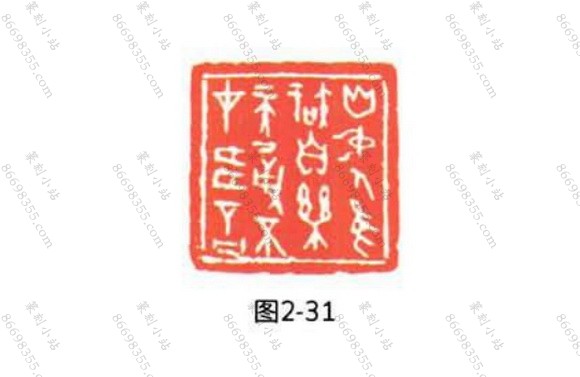 “山中人只知自乐,天下事不在多言”一印(图2.31),依据字形特点进行调整后分为四列,在四列分明的基础上根据字形进行安排,整体上形成自然的开合关系。笔者认为,此印章法的安排虽与前文所述少字印相比稍显平淡,但却是简氏基于多种尝试。-后所呈现出来的,其效果亦有可观处。