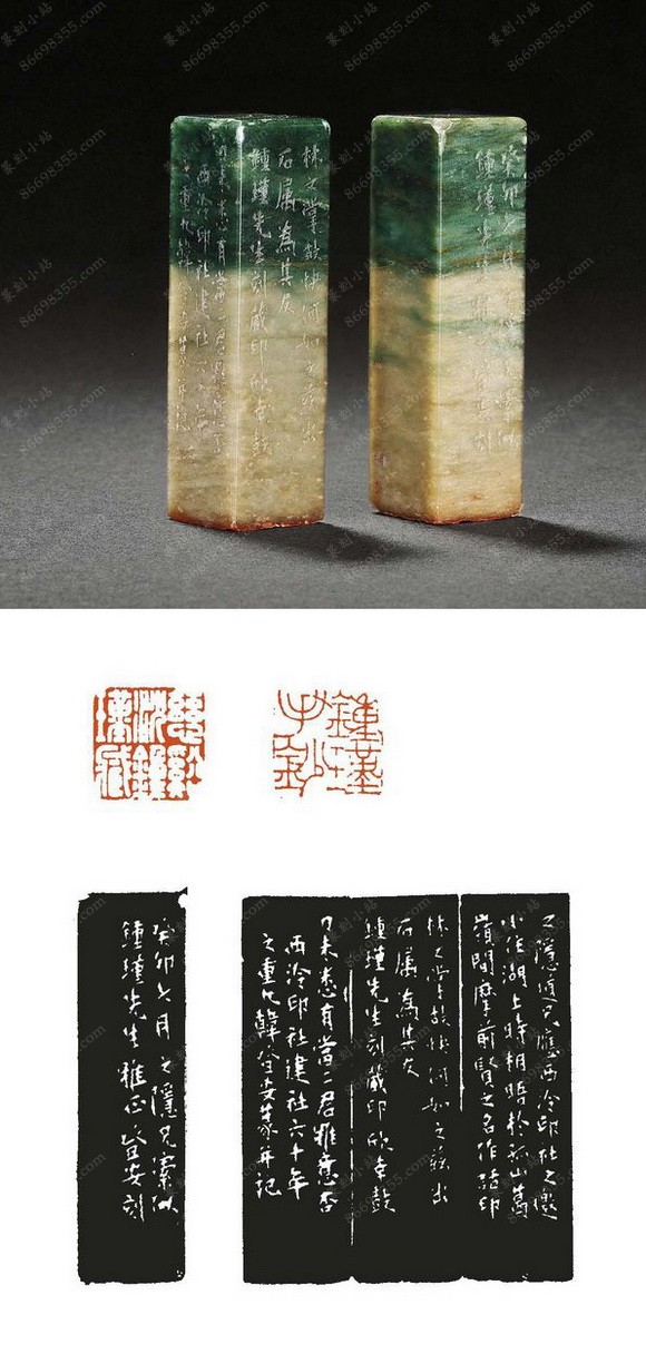 边款:1. 之隐道兄应西泠印社之邀,小住湖上,时相晤于孤山葛岭间,摩前贤之名作,话印林之掌故,快何如之,兹出石属为其友,锺谨先生刻藏印,欣喜鼓刀,未悉有当二君雅意否。 西泠印社建社六十年之重九,韩登安篆并记。 2. 癸卯七月之隐兄索似,锺谨先生雅正,登安。