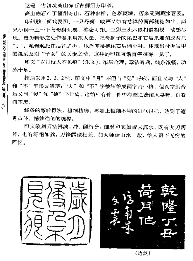 展示了其收藏的千余方古印中的近百枚精品,并按警句、印章吉语、闲文、斋饭、别号等分类,对每枚印一一“说印石、赏印纽、解印文”,展开全方位赏析。除此之外,作者还结合图例,在书中介绍了于收藏实践中归纳出的“假印章辨识六法”。出版界人士说,该书融赏析、知识、实用为一体,所以受到了各方面读者的青睐。