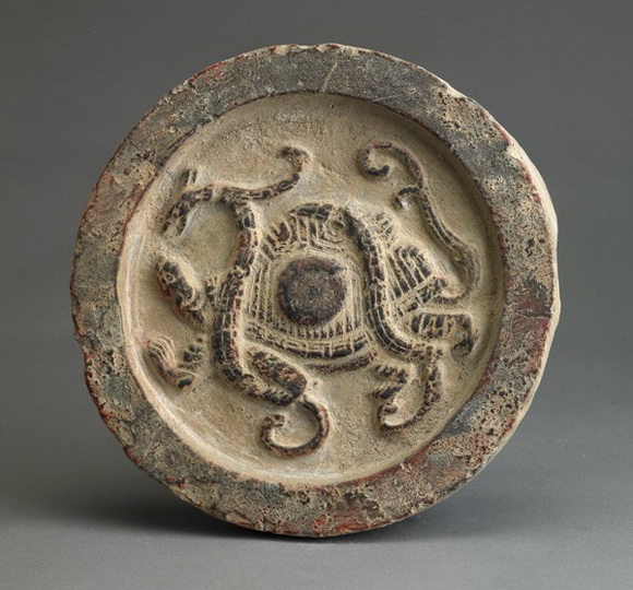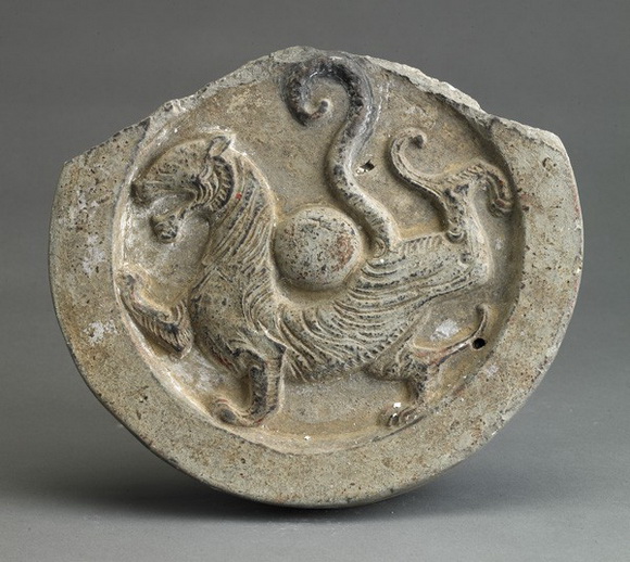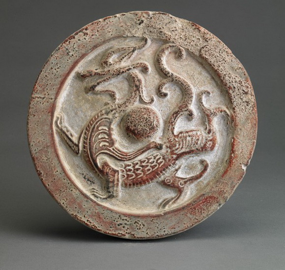 青龙,为主东方之神灵。中国人将龙作为永恒的图腾。瓦当上的苍龙形象矫健威烈,这个能腾越长天,潜伏深渊,能排空御气、翻江倒海的莫须有的怪物,被厚重的圆环圈定在这小小的瓦当上,身手难以施展,仿佛英雄少了用武之地。矫健依然矫健,却不免有几许无奈。