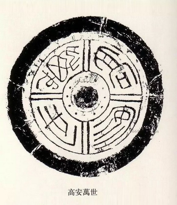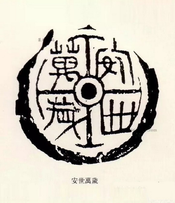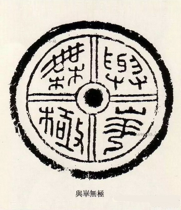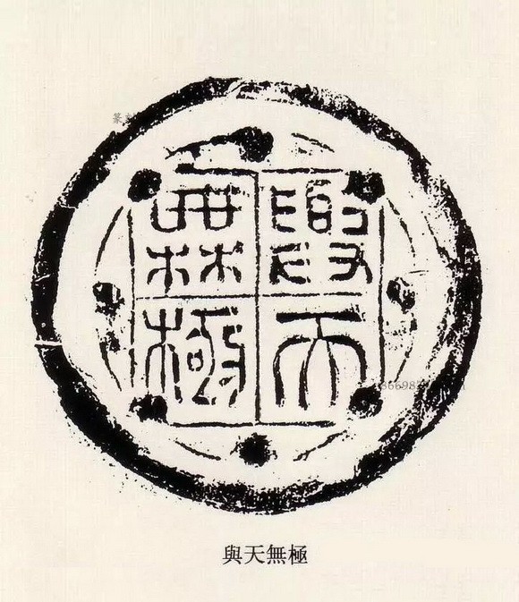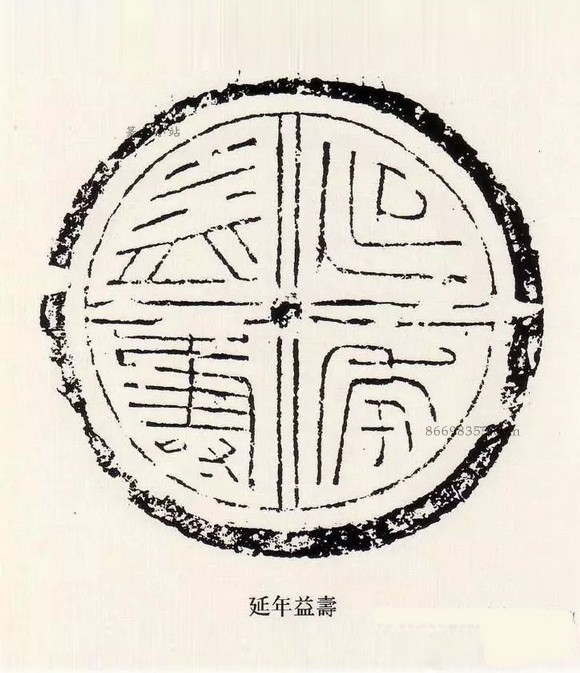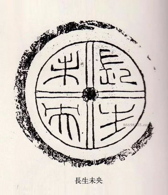 瓦当是古代中国建筑中覆盖建筑檐头筒瓦前端的遮挡,其内容丰富,词藻华丽,内容多吉祥颂祷之辞,如“长生无极”“长乐未央”“长生未央”“富昌未央”“千秋万岁”“延年益寿”“与华无极”“与华相宜”等,圆心为中心,向四面八方伸出辐射线,如太阳纹,但将它的排版格式运用到小小的一枚印章当中,却也极具动感和韵律美,显示出汉代艺术古拙质朴的风格,简而不俗,夸而不饰,饰而不诬。