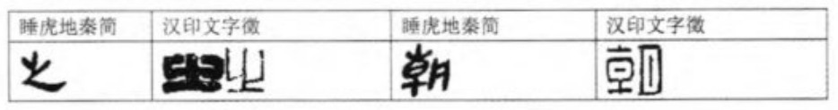 受制于铜铸、凿刻方式方法而出现“点幽平弧化、点画连接化、线性点両方折化”的不只是汉印,还有较早的青铜器铭文等,从汉印基本风貌上这些都很容易看出。汉印文字在更加方折、规整有别于书写文字的同时,其对称方式方法更加突出。中国古代文化对“对称、平稳”有特殊好感,能体现稳定、平展、端庄的气韵,最主要能够体现形制堂皇、气象雍容。故宫如此,唐代的长安城也是如此。这是汉印创作时的美学要求,更是汉印文字在应用过程中发生讹变的重大原因,不仅体现在汉印讹变文字当中,还贯穿所有汉印文字。拿“之”“朝”两字来分析。“之”字在秦简中笔画偏向左边显而易见,汉印“之”字竖画移向中间,其他笔画两边对称分布,甚至为了对称,将左右两个点画相连接在竖画的一个点上,类似的还有牛、亦等文字。汉印文字的对称不仅表现在点画上,还有结构、章法上。如“朝”,不仅在点画上左右对称,结构留白和左右偏旁部首全部体现了对称原则。
