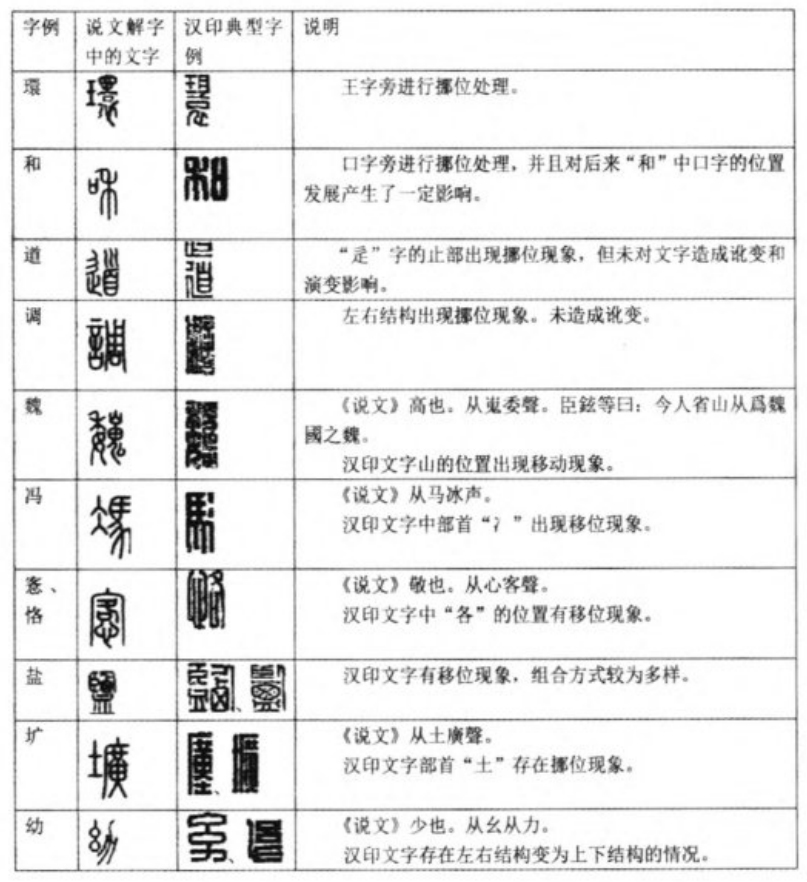 金文文字存在“左右无別”现象,至汉印,文字经过不断规范,“左右无别”现在应用不再广泛,但也还能找出一些。它们出现“左右、上下结构的挪移”。这种现象区别于古文字因为象形、无规明的“左右无别”,它是因为汉印创作时美学因素的作用。