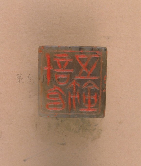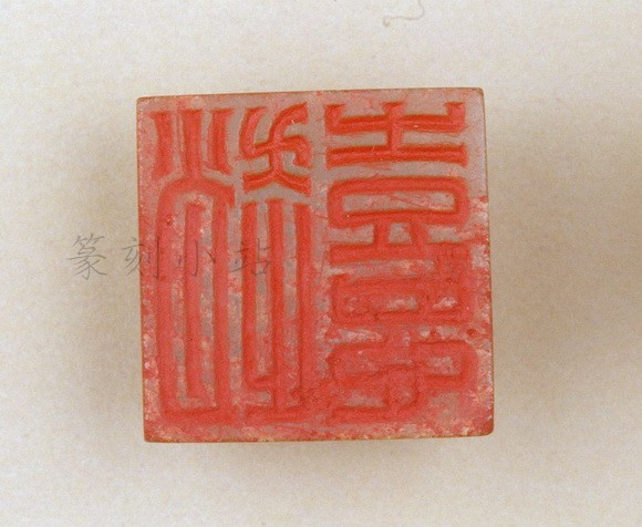 此为战国时期楚国印,青玉琢造,鼻钮。印文字体为战国古文,白文,右上起顺读“计官之鉩”四字。“计官”为官名,掌管记书簿册事务。印文篆体笔画挺拔。印面有阴线边栏,与同时期铜印印面常见格式相同。此印玉色青灰,材质本身呈透明状,细观有天然斜纹,凝者如风吹斜柳,散者如烟云片片。