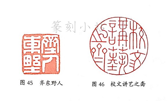 图45、图46二印一方一圆,分别表现平和、娟秀的意境,朱文印又是随形施篆、 依托边框以约束印文的,故不用残边。