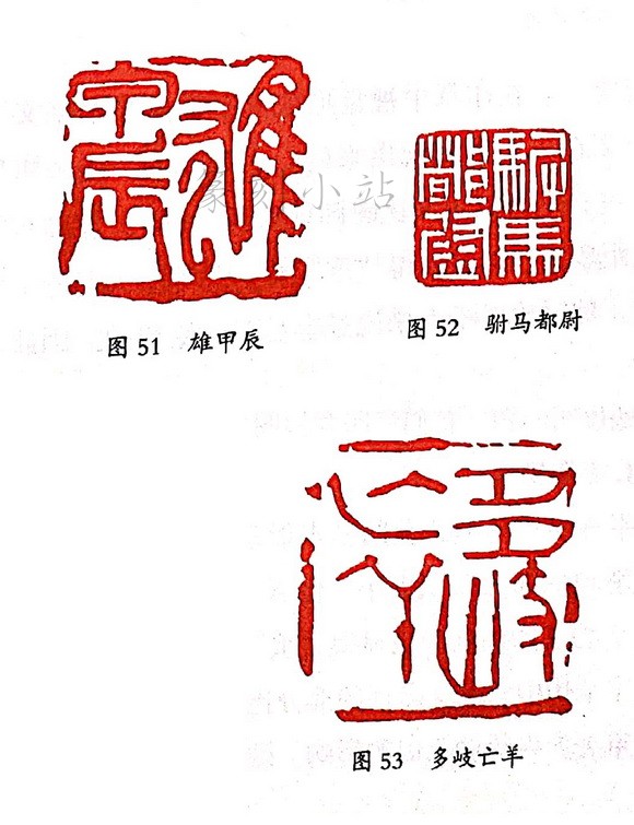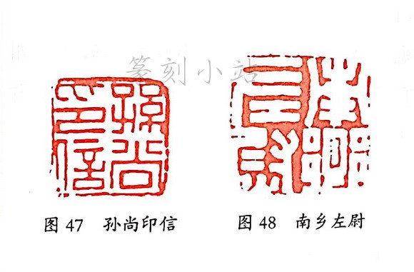 传世古玺印由于自然锈蚀、磕损等原因,造成印边的粘连或残破,往往使原印 增添苍莽古朴的风貌(图47、图48)。后世的印人常借鉴并采用这一形式,如图49、 图50。