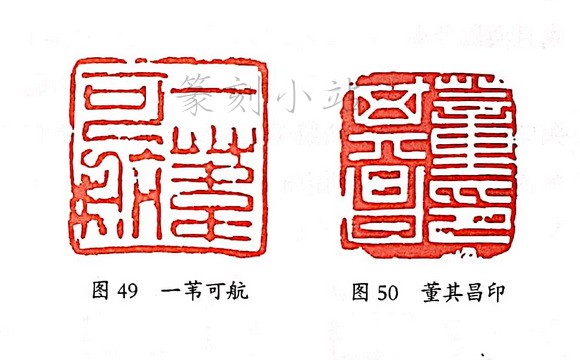 在印章中,变通常边框均匀为有粗有细(图51、图52),可以突出虚实对比,使人感受强烈、生动。运用粗细边还可以与印文互为作用,调节构图上的轻重。如图 53右侧两字笔画多而粗重,左侧则相反,加粗左边,并残损右边,视觉上便感到平衡了。