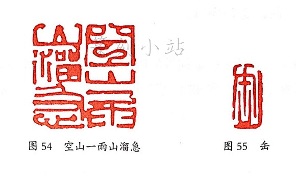 图54这种形式,其实无边而貌似有边,它利用印文四周的横竖笔画充作边框, 造成人们的视错觉,取得耐人寻味的效果。也有采取部分借边的(图55)。