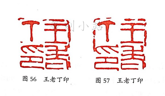边框处理形式,在设计印稿时就应大体成竹于胸,使其恰到好处地与印作的总体 布局浑然一体。以残边来说,何种宜残、何种不宜多残以及何处可残,都要认真权 衡。如“王老丁印”(图56)初设计时,左面边框拟全残去,这样造成构图上左右失 衡且涣散分离,改成图57那样,就妥帖紧凑了。