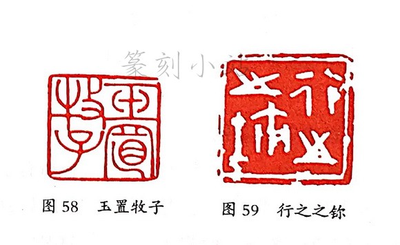 当然,印作刻成后,还要根据抑出的印銳,进行必要的修葺,其中包括残边。如果印作原拟表现雅洁妍美的格调,印边就不宜多残(图58 );相反如果为了强化苍古 的情趣,则不妨借助边框的残缺(图59 )。