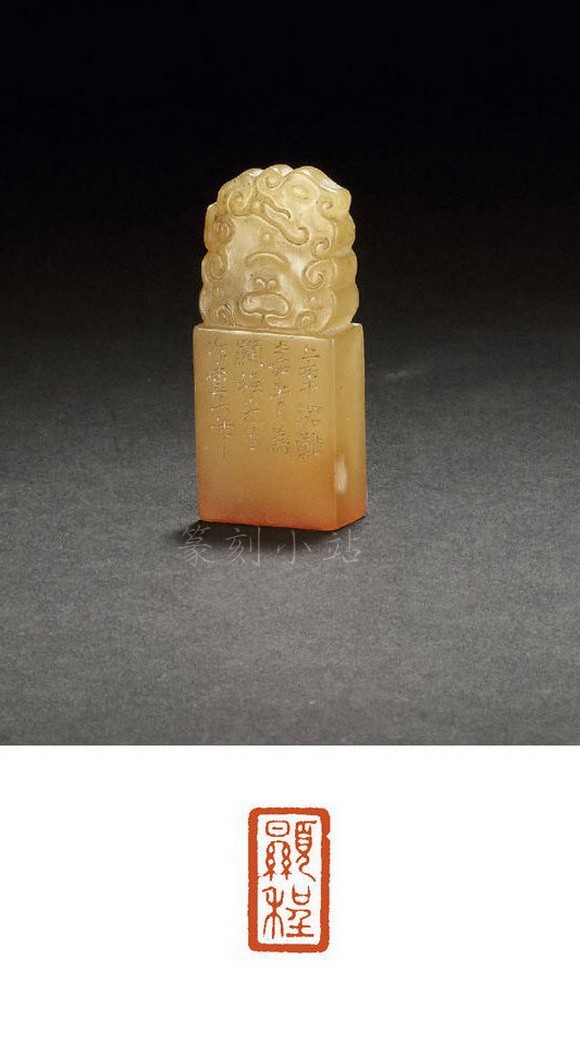 说明:此田黄石章形近扁而随形,质地通透有灵气,颜色明亮又略带变化。林清卿以石形之不同变化,巧妙构思并从整体布局,巧妙雕绘山石苍松,取正面微凸之处着寥寥数刀,巍峨之势顿时显现,且极具立体之感。山体两侧,苍松翠柏顺势蜿蜒。构图层次丰富,重点突出,将中国画的笔墨韵味和悠远意境与田黄石的通灵细润完美融合。印面为西泠元老童大年所篆,语出唐孙过庭《书谱》:“是知偏工易就,尽善难求。虽学宗一家,而变成多体,莫不随其性欲,便以为姿。”今又增一美,藏家更当宝之!